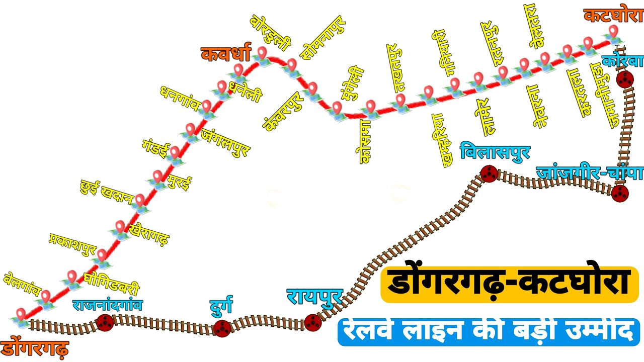 कटघोरा से बांधाखार, करतली, नेवसा होकर रतनपुर के रास्ते मुंगेली, कवर्धा,खैरागढ़ होकर डाेंगरगढ़ तक जाएगी। लाइन के निर्माण का मकसद कोयला परिवहन है। केन्द्र सरकार बिलासपुर-नागपुर रेल लाइन पर गाड़ियों का दबाव कम करना चाहती है। इस रेल लाइन में कटघोरा से डोंगरगढ़ के बीच 27 स्थानों पर रेलवे स्टेशन बनाने का प्रावधान है। इसमें कटघोरा- कवर्धा तक 15 जगह और डोंगरगढ़ से राजनांदगांव तक 12 स्थान पर रेलवे स्टेशन बनाया जाना है।
