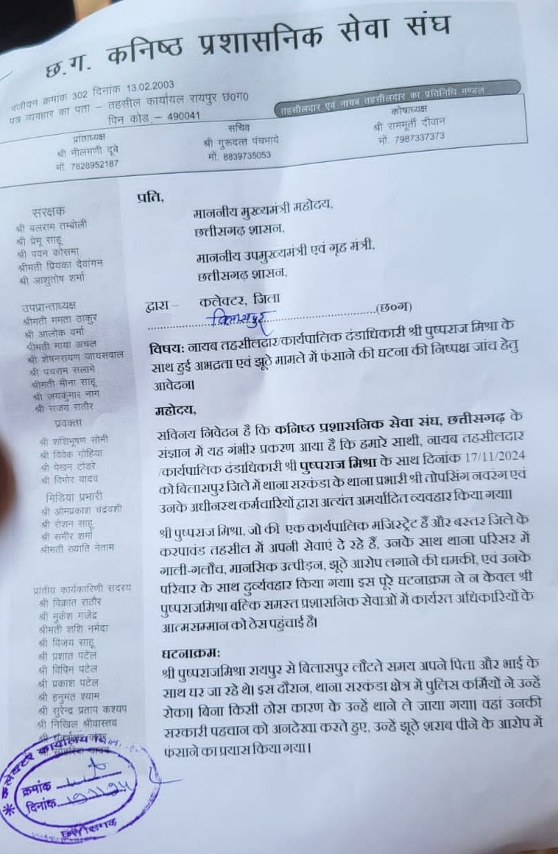 मुख्यमंत्री, उपमुख्यमंत्री व गृह मंत्री छत्तीसगढ़ शासन के नाम कलेक्टर को सौंपे ज्ञापन में छत्तीसगढ़ कनिष्ठ प्रशासनिक सेवा संघ ने बताया है कि बस्तर जिले के करपावंड तहसील में सेवाएं दे रहे नायब तहसीलदार पुष्पराज मिश्रा के साथ बिलासपुर जिले में थाना सरकंडा के थाना प्रभारी तोपसिंग नवरंग एवं उनके अधीनस्थ कर्मचारियों द्वारा 17 नवंबर को अमर्यादित व्यवहार किया गया। थाना परिसर में गाली-गलौच, मानसिक उत्पीड़न, झूठे आरोप लगाने की धमकी, उनके परिवार के साथ दुर्व्यवहार किया गया। पुष्पेन्द्र मिश्रा के भाई ने घटना की जानकारी कलेक्टर को दी, तो भी थाना प्रभारी ने इसे गंभीरता से नहीं लिया और अभद्र व्यवहार जारी रखी।