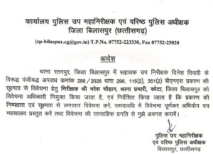 लिखित शिकायत मिलने के बाद रतनपुर थाने में ही पदस्थ सहायक उप निरीक्षक दिनेश तिवारी के विरूद्ध अपराध कमांक 288/2026 में भारतीय न्याय संहिता की धारा 296, 115(2), 351 (2) के तहत यानी अश्लील गाली-गलौच, मारपीट और आपराधिक धमकी देने का अपराध दर्ज कर लिया गया है। इस मामले की विवेचना के लिए कोटा थाना के प्रभारी निरीक्षक नरेश चौहान को विवेचना अधिकारी भी नियुक्त किया गया है।