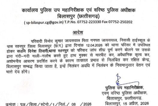 वरिष्ठ पुलिस अधीक्षक बिलासपुर ने प्रार्थी विनोद कुमार जायसवाल के लगाएं आरोपों को गंभीरता से लेते हुए सउनि दिनेश तिवारी को निलंबित कर। गंदी-गंदी गाली-गलौच कर हाथ मुक्का से मारपीट करने को अवैधानिक कृत्य, और अशोभनीय आचरण मानकर निलंबित एएसआई को रक्षित केन्द्र, बिलासपुर सम्बद्ध कर दिया है।