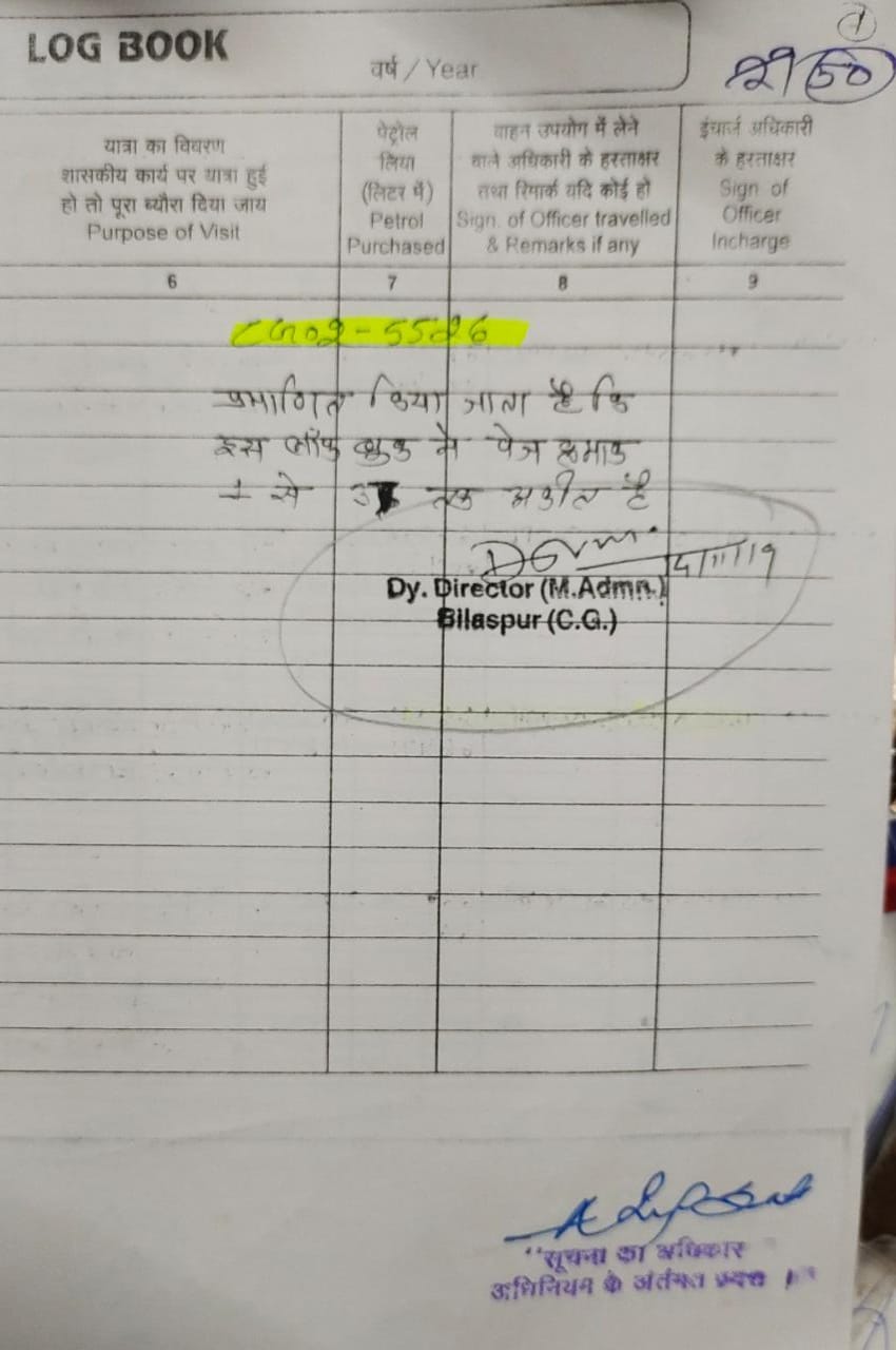 जिला कार्यालय खनिज शाखा बिलासपुर को शासन से वाहन क्रमांक सीजी 02 5526 आबंटित किया गया है । इसका उपयोग दिनेश मिश्रा उप संचालक खनिज प्रशासन बिलासपुर के साथ खनिज निरीक्षक राहुल गुलाटी द्वारा किया जाता है। गाड़ी में लगे माइलोमीटर में एक ही गंतव्य स्थल की दूरी अलग- अलग दर्ज की जा रही है। कभी माइलोमीटर में दूरी 20 किलोमीटर तो कभी 58 किलोमीटर की दूरी देखने को मिलती है जिसका लॉगबुक यानि गति माप पुस्तक में अंकन किया गया है।