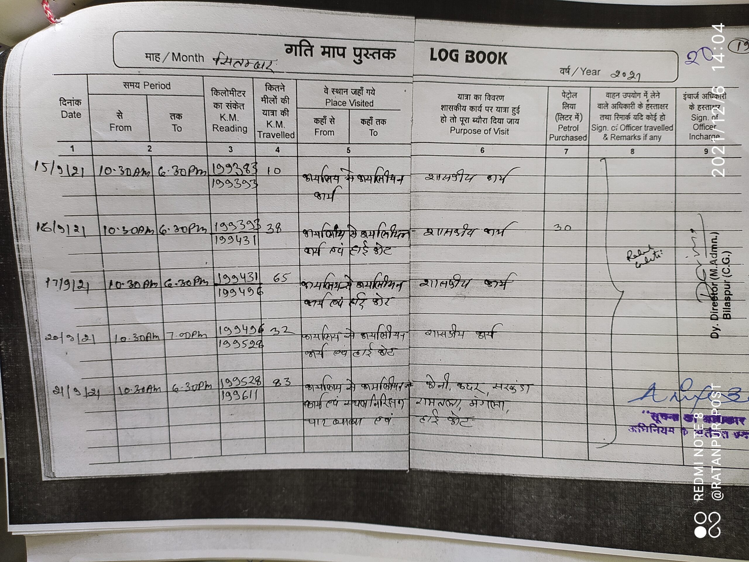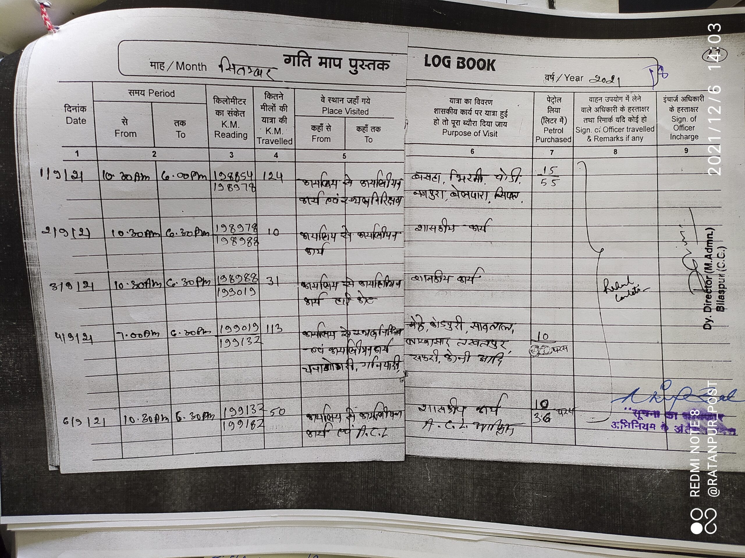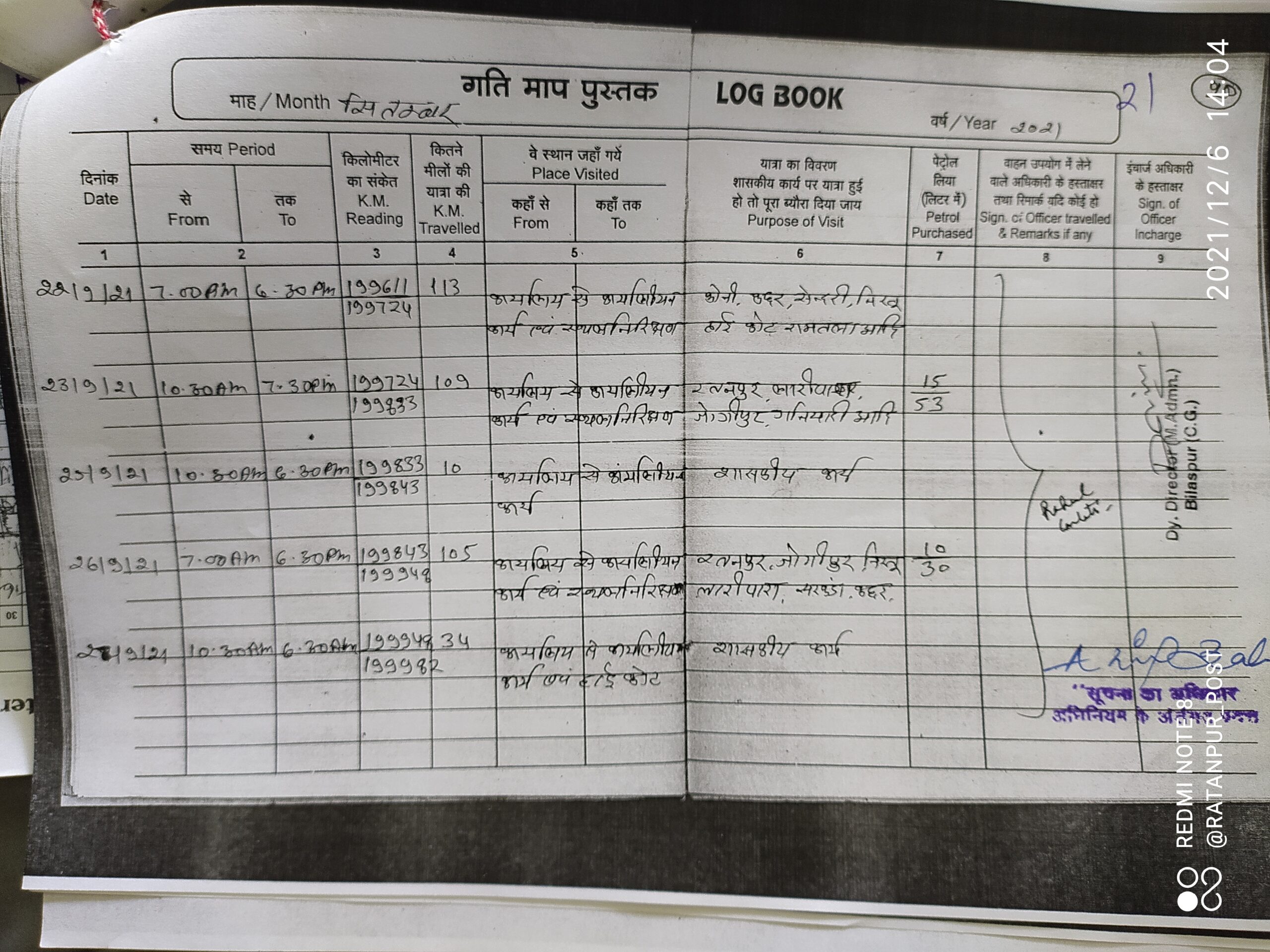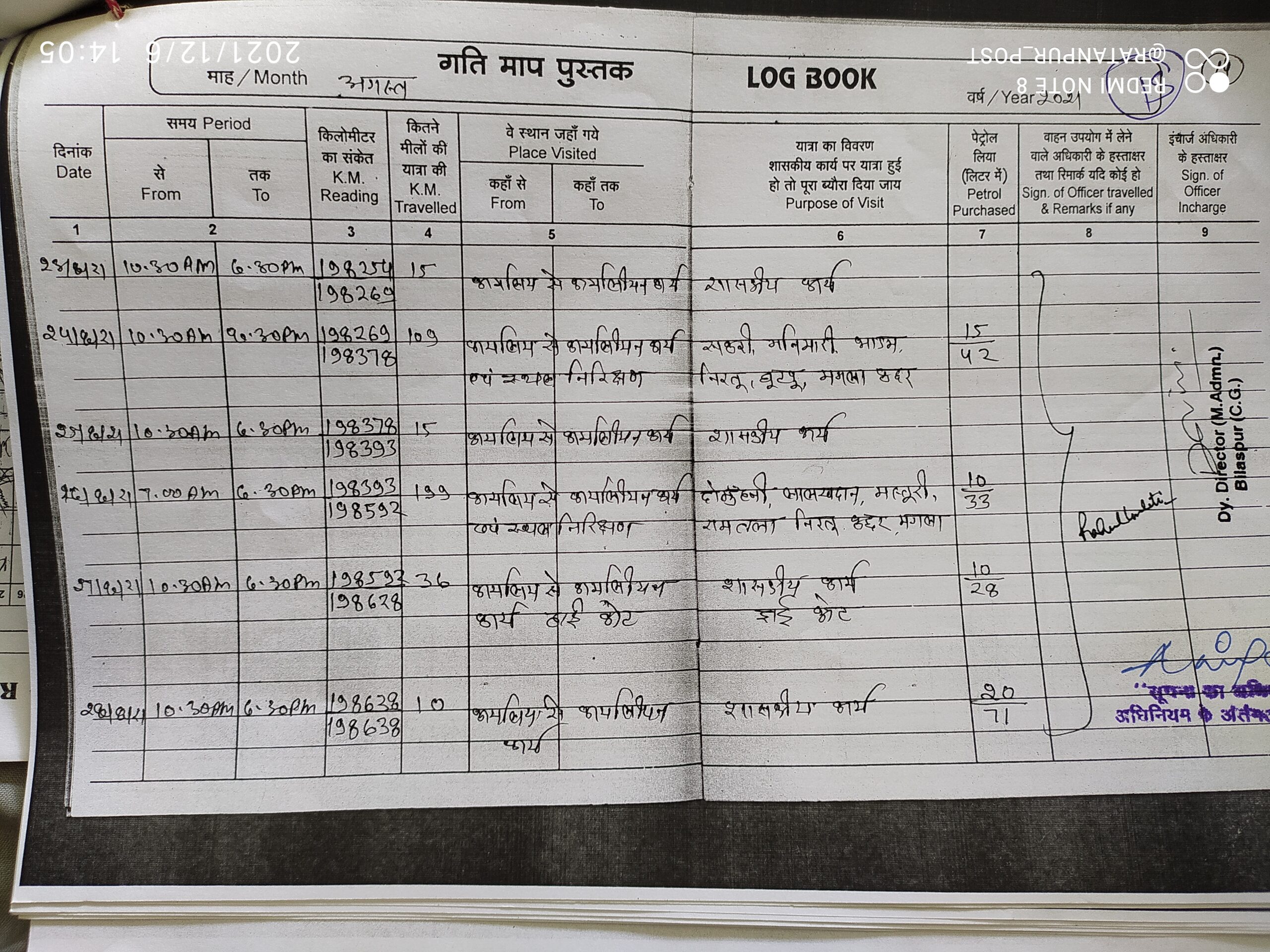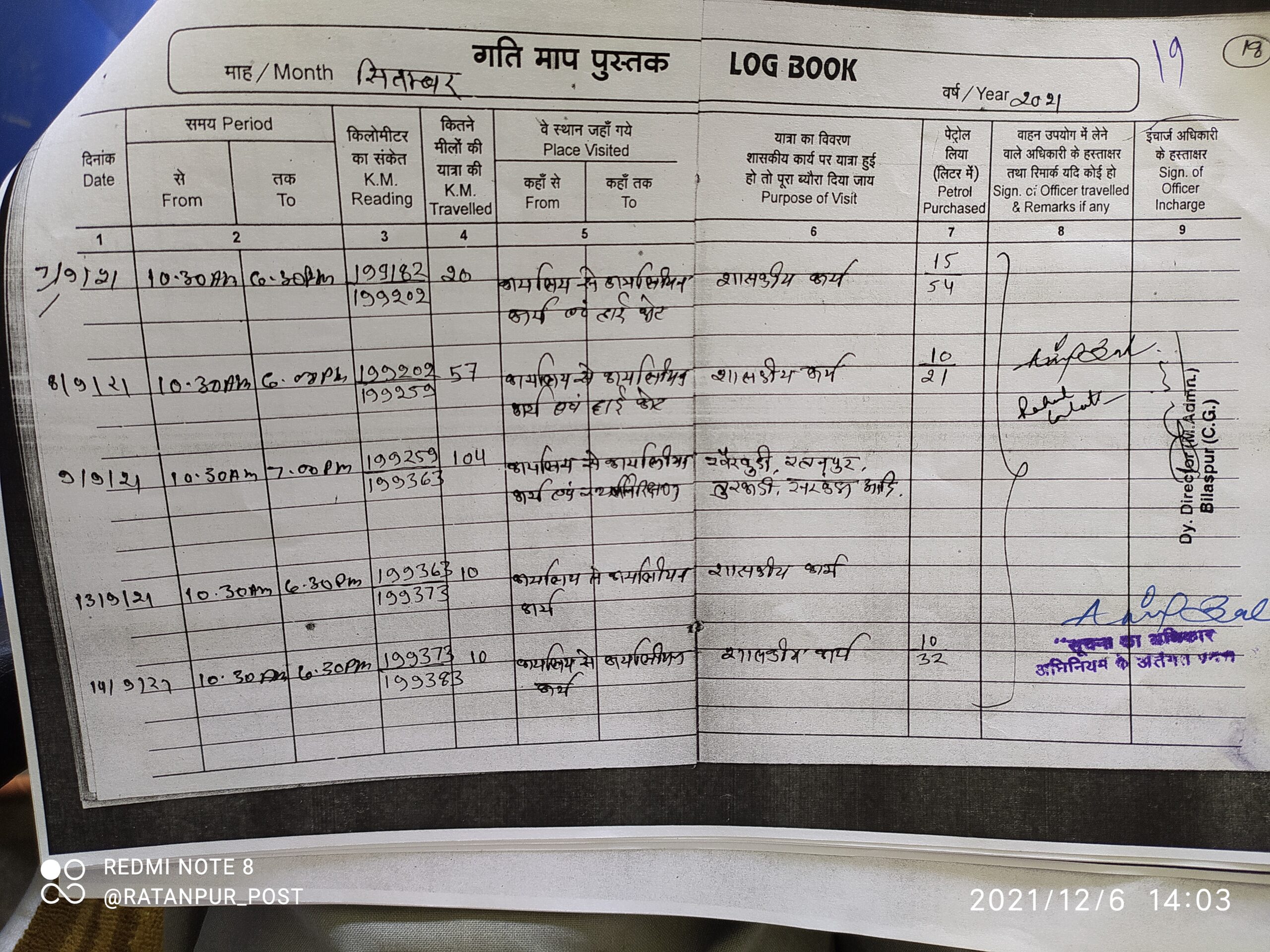 खनिज निरीक्षक राहुल गुलाटी ने 22 जुलाई 2021, 27 अगस्त 2021, 03, 07, 08,16 और 28 सितंबर 2021 सहित अन्य तिथियों को छत्तीसगढ़ उच्च न्यायलय बिलासपुर की सरकारी यात्रा की है जिसे वाहन क्रमांक सीजी 02-5526 के लॉग बुक में दर्ज किया गया है एक हि गंतव्य स्थल की दूरी यानी सड़क की लंबाई बढ़-घट गई है लॉग बुक में दर्ज दूरी कभी 20 किमी तो कभी 30, 47, 36, 31, 57, 38 किलोमीटर दर्ज किया गया हैँ ऐसे ही लॉगबुक भरने में और भी गंभीर विसंगतियां की गई है।