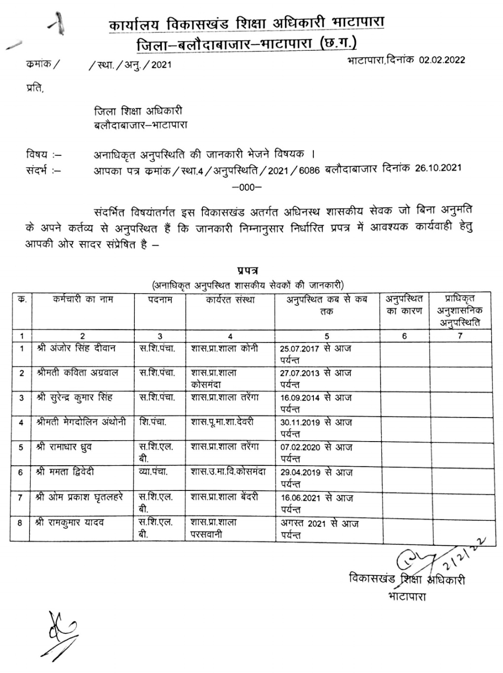 बिना कारण लंबे समय से अनुपस्थित इन 8 टीचरों के नाम सहित सभी जानकारी जिला मुख्यालय भेजी जा रही है। दिशा- निर्देश की प्रतीक्षा है।