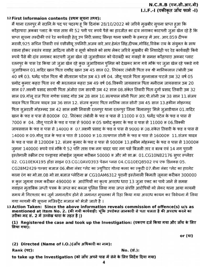 रतनपुर थाना पुलिस ने 15 आरोपियों में से 13 के खिलाफ ही 13 जुआ एक्ट के तहत अपराध दर्ज किया है एफआईआर में दर्ज 13 नामों में पुजारी और ज्योतिष पुत्र के नाम गायब होना चर्चा का विषय बन गया है. जुआ खेलते पकड़ाए पुजारी और ज्योतिष पुत्र को अभयदान देना और कांग्रेस और भाजपा नेताओं, पार्षद के साथ पत्रकार को औकात बताने की भी जम कर चर्चा है. रतनपुर थाना पुलिस दर्ज एफआईआर में 13 आरोपियों के नाम हैं इसमें आरोपी कांग्रेस भाजपा नेता, पार्षद और पत्रकार के नाम शामिल है. वहीं आरोपियों के जारी फोटो में कांग्रेस भाजपा नेता पार्षद के चेहरे नदारद है.