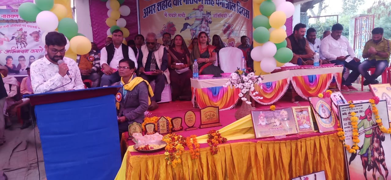 बिलासपुर। मुंगेली के जमकोर गांव में शहीद वीर नारायण दिवस मनाया गया जिस में प्रगतिशील छत्तीसगढ़ सतनामी समाज के जिलाध्यक्ष बिलासपुर टूकेंद्र बंजारे सामिल हुए। कार्यक्रम के मुख्य अतिथि के रूप मे शामिल हुए जिला पंचायत अध्यक्ष मुंगेली श्रीमती लेखनी सोनू चंद्राकर ,जिला उपाध्यक्ष संजीत बनर्जी, शेखर बनर्जी एवं छाया विधायक मुंगेली राकेश पात्रे जी उपस्थित थे। कार्यक्रम में जिला पंचायत उपाध्यक्ष संजीत बनर्जी के द्वारा बताया गया कि आदिवासी समाज के लिए शहीद वीर नारायण सिंह जी समाज के धरोहर के रूप में भी जाने जाते हैं उनके कार्यों को नहीं बुलाया जा सकता। इस कार्यक्रम में आदिवासी समाज ने बढ़ चढ़कर हिस्सा लिया। कार्यक्रम के दौरान करमा नृत्य बच्चों के द्वारा शानदार प्रदर्शन भी किया गया।