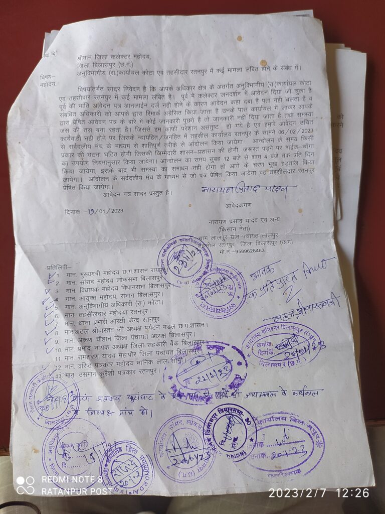 नारायण प्रसाद यादव ने बताया अनुविभागीय अधिकारी राजस्व कार्यायल कोटा व तहसीदार रतनपुर में कई मामले लंबित है। उसके संदर्भ में पूर्व में कलेक्टर जनदर्शन में आवेदन किया गया है। आनलाईन दर्ज नहीं होने के कारण आवेदन कहाँ दबा है पता नहीं चलता है। कलेक्टर संबंधित अधिकारी को रिमार्क कर अग्रेसित किया जाता है । संबंधित कार्यायल में जाकर अग्रेसित आवेदन पत्र के बारे में पुछने पर जानकारी नहीं दिया जाता है। समस्या जस की तस बना रहता है। आवेदन पर उचित कार्यवाही नहीं होने पर न्यायहित जनहित में तहसील कार्यालय रतनपुर के सामने 6 फरवरी से सर्वदलीय मंच के माध्यम से शांतिपूर्ण तरीके से आंदोलन करने की सूचना संबंधित कार्यालयों में दी गई थी। इसमें जरूरत पड़ने पर माईक चोंगा का उपयोग नियमानुसार करने की बात भी कही गई थी।